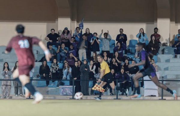 The match started with high intensity, and just five minutes in, NU-Q conceded a goal through a counterattack from the TAMU-Q player, Abdulrahman Al Edrisi. Yet NU-Q’s supporters did not let that affect their morale and continued to cheer. Students supported their friends and colleagues, playing in the field: “Go East! Go west! Northwestern is the best!”